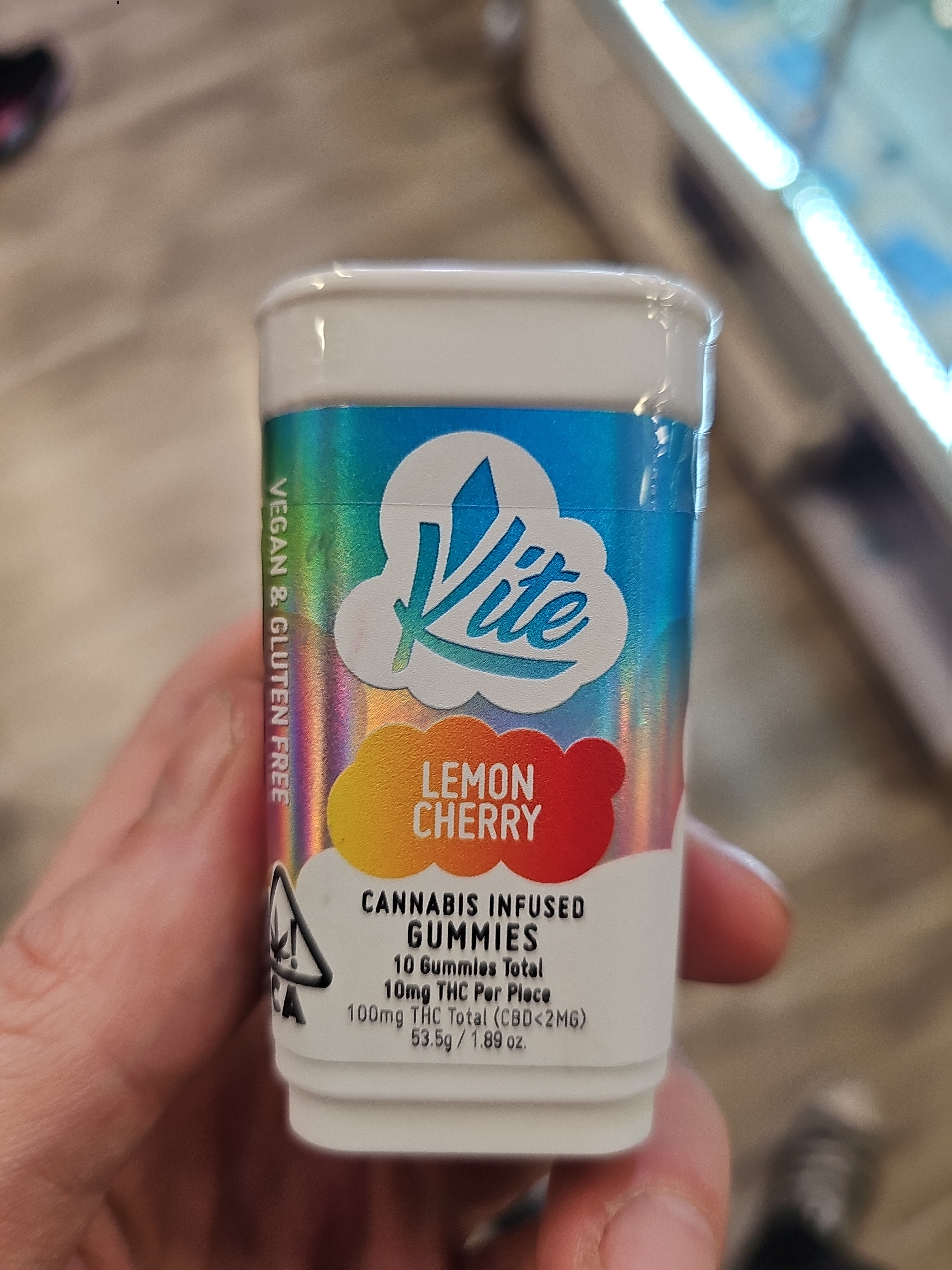 This Lemon Cherry gummy edible by Kite offers a vibrant and playful experience with its blend of natural and artificial flavors. Infused with cannabis and marked as vegan and gluten-free, this product is designed for relaxation and enjoyment. Each gummy contains a precise dosage of 10mg THC, with a total of 100mg THC per pack. The packaging is colorful, shiny, and cylindrical, with an included leaf symbol and resealable feature for freshness and child safety.