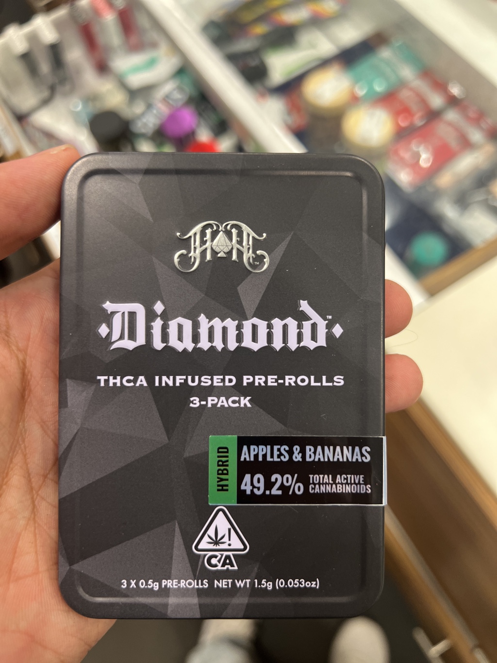 THCA infused pre-rolls, offering a hybrid strain experience with a blend of apples and bananas flavors.