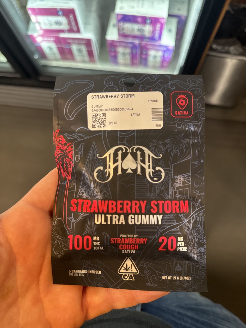 Strawberry Storm Ultra Gummy is an edible gummy infused with the Sativa strain known as Strawberry Cough, designed to provide an uplifting and energizing effect. Each package contains 10 gummies with a total of 100 mg THC, and each gummy contains 10 mg THC. The packaging is a black resealable bag with metallic red and white detailing, featuring a prominent Heavy Hitters logo and a window displaying the gummies.