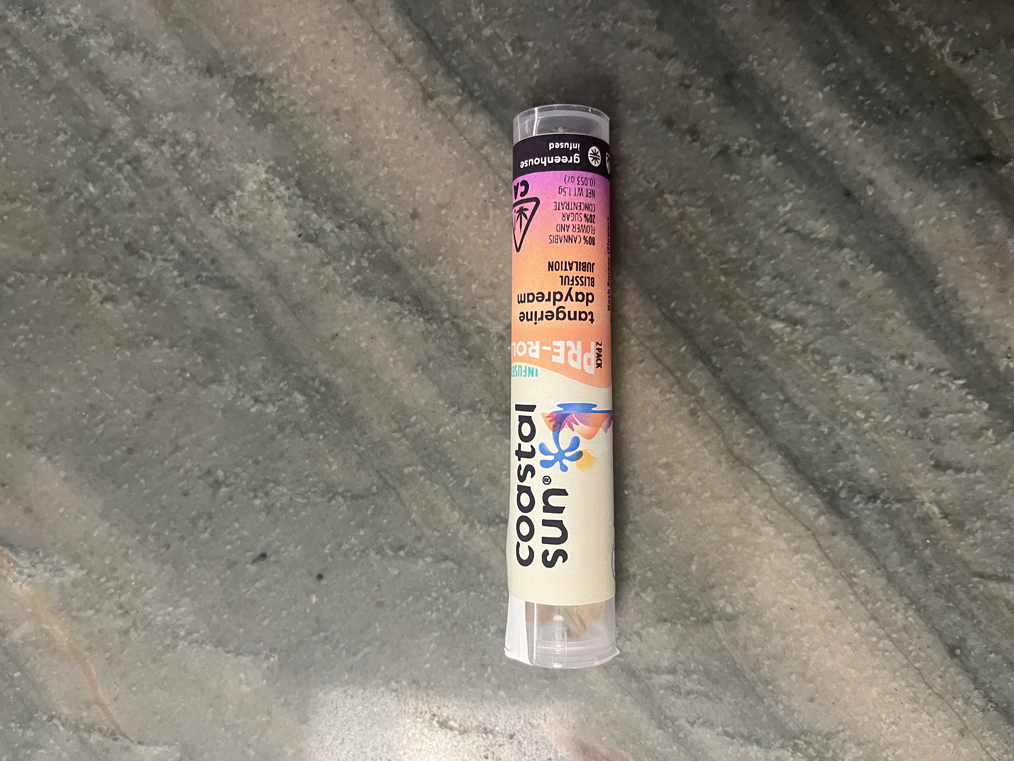 Tangerine Daydream is a pre-rolled cannabis product designed for ease of use and convenience. Infused with Dirty Tangle concentrate, it promises enhanced effects. Made with regeneratively farmed plants, emphasizing sustainability and organic practices, this hybrid offers a citrusy flavor profile intended to evoke feelings of relaxation and jubilation.
