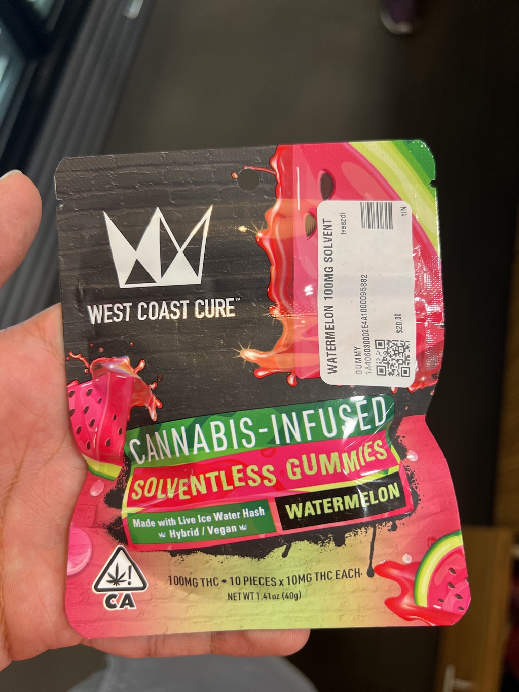 Watermelon Solventless Gummies by West Coast Cure is a premium cannabis edible. This vegan edible is infused with live ice water hash, offering a balanced hybrid effect for a full-body and uplifting experience. Each package contains ten gummies, each infused with 10mg THC, summing up to a total of 100mg THC per package.